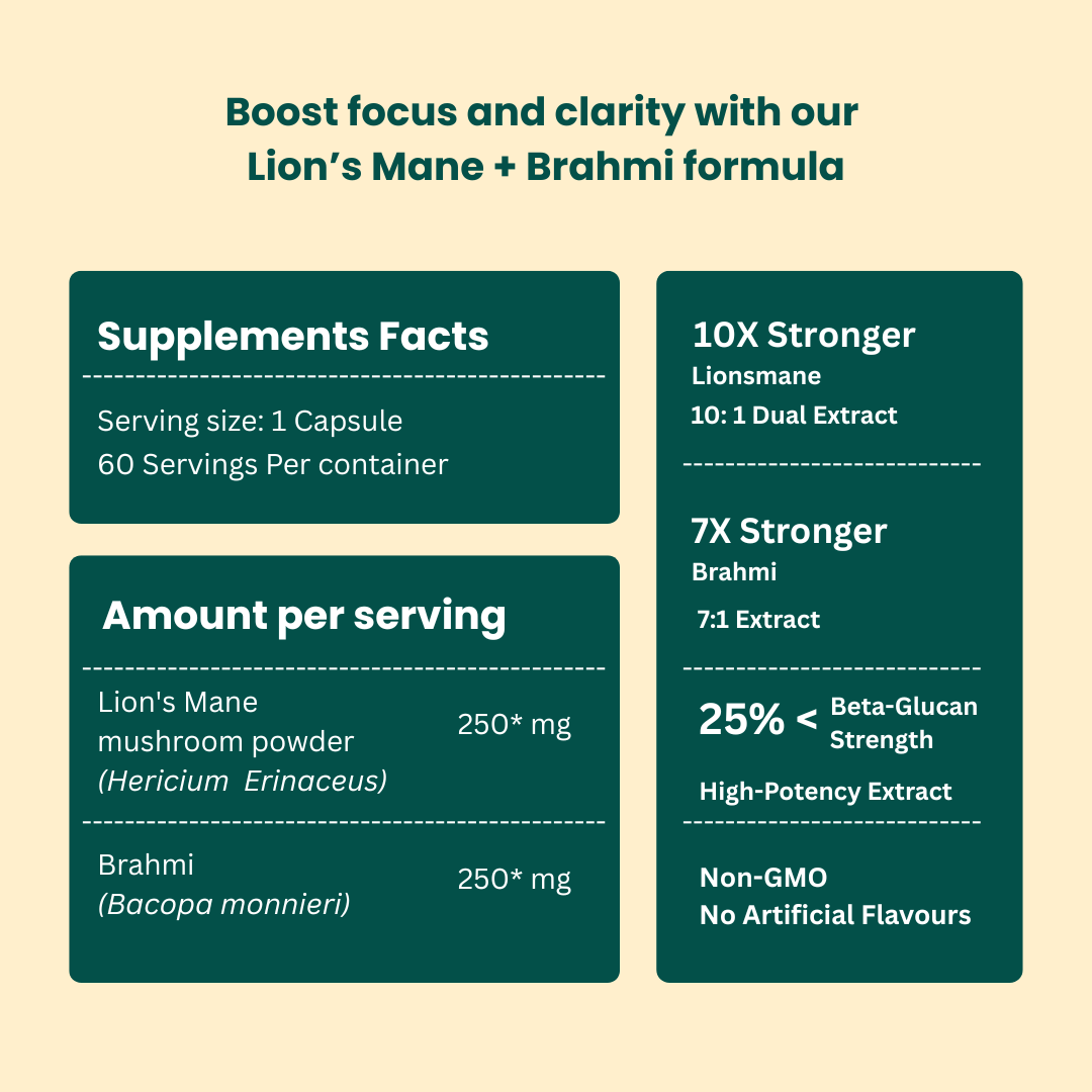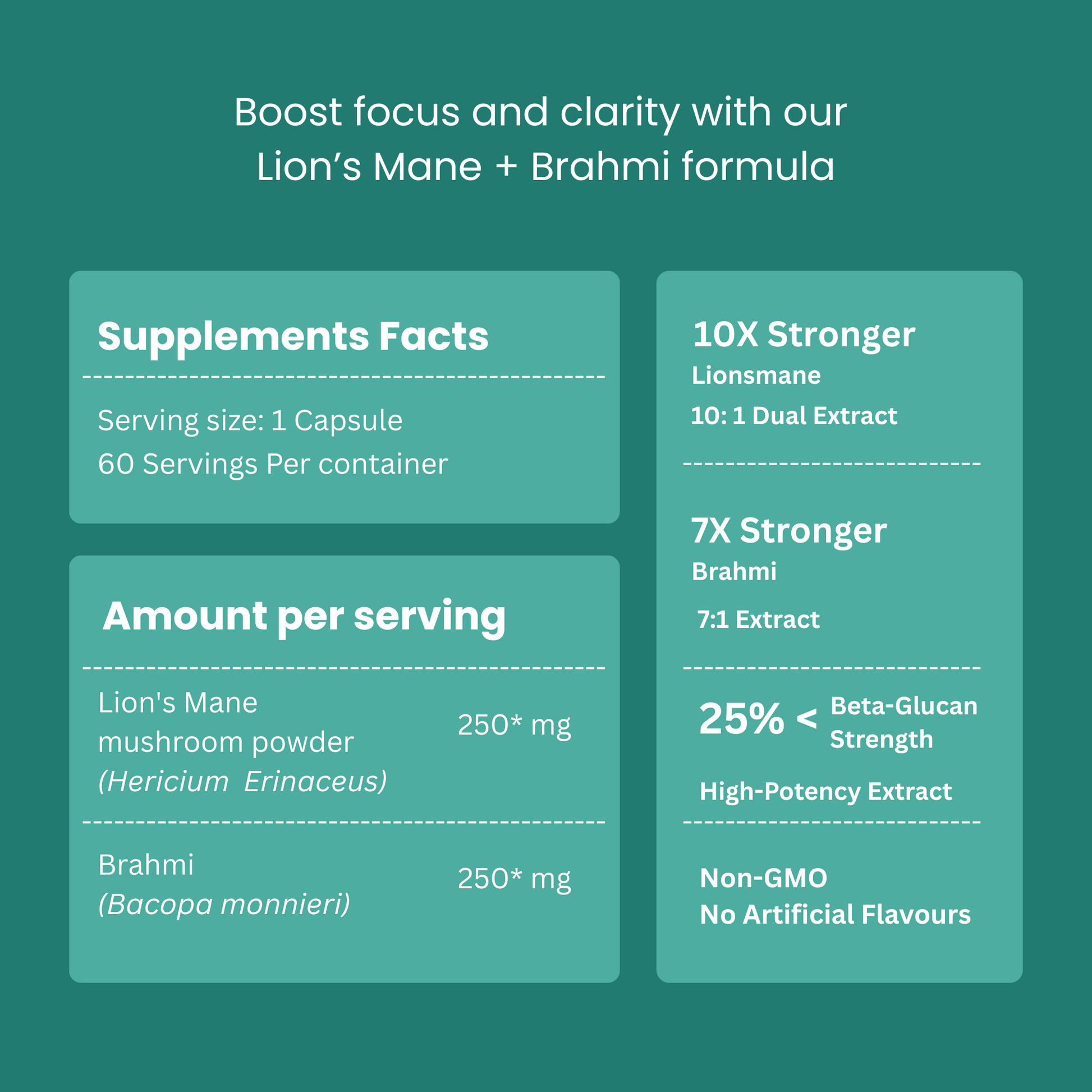 Lion's Mane Brahmi Capsules are a plant-based herbalsupplement, made with: